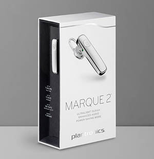 2. 從藍牙耳機的顏色和質感出發,包裝盒使用了白色底,灰色和燙銀的文字,產品實物圖占盒子正面的一半,與下方的文字和上方的線條排版十分恰到好處,畫面簡潔協調。