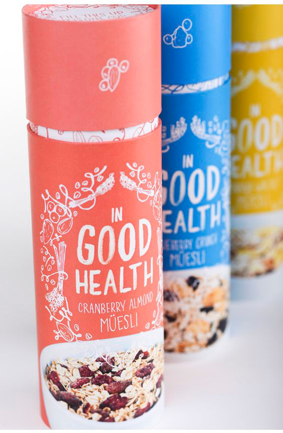 ? ? 我們在生活中經(jīng)常見到的食品包裝一般是袋裝、盒裝或塑料罐裝的,像圖片中這種圓紙筒形狀的食品包裝設(shè)計還是比較少見的,三種口味的麥片分別用三種不同的顏色區(qū)分,手繪圖案和字體倍顯清新溫暖。