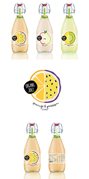 ? ? 這一系列的果汁都是兩種水果混合口味的,因此設(shè)計(jì)師將瓶貼圖案設(shè)計(jì)為水果的組合,信息一目了然,色彩也很明亮。