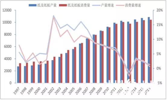 據統計,2010-2015年間,造紙行業共淘汰落后產能近4000萬噸,去產能效果逐步顯現,2013年紙及紙板產量與消費量均出現下滑,2016年紙及紙板產量與消費量接近零增長,行業供需趨于弱平衡。